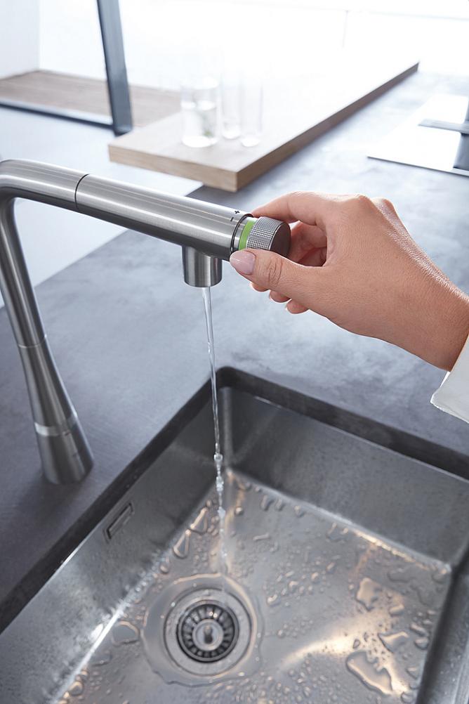Tüketiciler, günlük yaşamlarını daha rahat hale getiren ürünlerin peşindeler. Yenilikçi GROHE SmartControl mutfak bataryası da işte tam olarak bu özelliği ile 2020’de on önemli ödül programında jüri üyelerini ikna etti. “SmartControl mutfak ile, bataryanın üzerine tamamen yeni bir kullanıcı etkileşimi sağlayan akıllı bir buton entegre ederek, mutfak bataryasını yeniden keşfettik,” diyen Patrick Speck, “Ürünün şekli mutlak minimuma indirgenerek dikkat dağınıklığı veya kafa karışıklığına yer bırakmıyor –en saf haliyle çoğulcu tasarım,” diye ekliyor. SmartControl mutfak bataryası, kumanda kolu kullanmak yerine, sezgisel bas ve çevir kullanım sunuyor. Su akışını başlatmak için, tüketici düğmeye basıyor. Aynı zamanda dirsek veya bilek ile de kolaylıkla çalıştırılan ürün, her iki elin de dolu veya kirli olduğu anlar için ideal. Butonu çevirerek, su miktarı tasarruf yapan eco-jet modundan güçlü jet akışı moduna hassas şekilde ayarlanabiliyor. Tek bir buton ile sezgisel kontrol, açık konfor ve en üst düzey esneklik sağlanıyor…