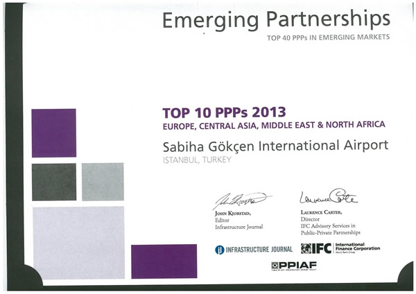 Orta Asya, Ortadoğu ve Kuzey Afrika Bölgesi’ndeki ‘En İyi İlk 10 Kamu Özel İşbirliği Projesi', tüm gelişmekte olan pazarlarda ise ‘En İyi 40 Kamu Özel İşbirliği Projesi’nden biri olarak seçildi. Geçtiğimiz hafta Washington D.C.’de düzenlenen törende Sabiha Gökçen’in işletmecisi İSG adına sertifikayı İSG CEO’su Gökhan Buğday, IFC'nin CEO’su Jin-Yong Cai'den aldı.