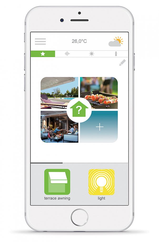 Somfy’nin Connexoon uygulaması ile tenteler, tablet ve cep telefonu gibi akıllı cihazlardan da tek dokunuşla kumanda edilebilir hale geliyor. Böylece siz yazlığınızda ya da evinizde değilken bile tenteniz açılıp kapatılabiliyor, o anki durumu kontrol edilebiliyor. Dilerseniz oluşturacağınız senaryolarla tenteniz seçtiğiniz konuma gelirken ışıklar da aynı anda açılabiliyor. Böylece istediğiniz zaman bahçe veya terasınızda tercih ettiğiniz ortam kolayca hazır hale geliyor.