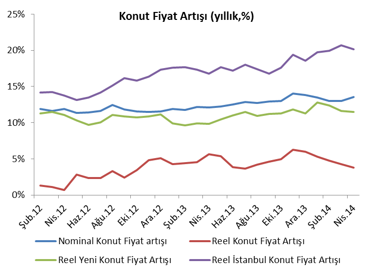 Bu yıl Mayıs ayında konut satışları geçen yılın aynı ayına göre yüzde 13 düşüş gösteriyor, Ocak-Mayıs döneminde ise geçen yılın aynı dönemine göre konut satışları yüzde 8.6 düşüş gösterdi. Kasım 2013’den beri konut satışları daha az. Reel konut fiyatları düşüyor, nominal konut fiyatlarındaki artış normal düzeyde; bu açılardan bakarsak konut balonu var demek için biraz erken.